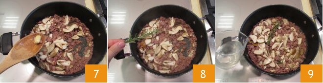 Aromatize com um ramo de alecrim, desfolhando-o 7. Alguns minutos depois, o líquido de cozimento terá evaporado, indicando que é hora de adicionar o vinho branco 8. Ajuste o sal e a pimenta, abaixe a temperatura e leve a água para a massa a ferver 9.