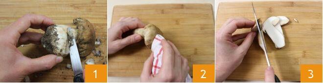 Para preparar as trofie linguiça e cogumelos, comece pela limpeza dos cogumelos. Primeiro, corte a base e retire a parte terrosa 1. Depois, esfregue delicadamente todo o cogumelo usando um pano úmido; se necessário, recomendamos também o uso de uma escovinha apropriada 2. Quando todos estiverem limpos, fatie os cogumelos em poucos milímetros de espessura 3.