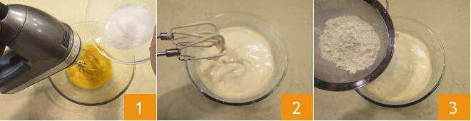Para preparar o tronco de Natal nevado, comece pela massa de biscoito. Em uma batedeira, coloque os ovos em temperatura ambiente, a essência de baunilha e ligue as pás em velocidade média, após alguns instantes adicione o açúcar em várias etapas 1. Deixe crescer por 10/15 minutos. Assim que o composto estiver firme 2, desligue as pás e peneire a farinha 3,