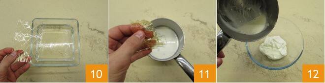 Enquanto isso, prepare o creme. Deixe o iogurte fora da geladeira por cerca de dez minutos. Coloque a gelatina em água fria 10. Enquanto isso, aqueça os 20 g de creme de leite em uma panela, tomando cuidado para não começar a ferver. Quando estiver na temperatura, escorra a gelatina e misture imediatamente para que se dissolva 11. Despeje a mistura recém-obtida na tigela com o iogurte 12