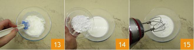 misture bem 13. Passe para o creme de leite, despeje em um recipiente largo, adicione o açúcar de confeiteiro 14 e bata com as pás: comece em baixa velocidade e aumente progressivamente enquanto cresce. Obtenha um composto montado mas não muito 15.