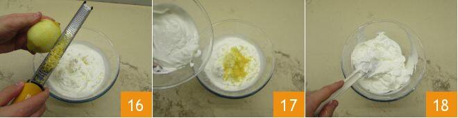 Rale a casca de limão 16 e incorpore junto ao composto de iogurte 17 com muito cuidado, com movimentos de baixo para cima 18.