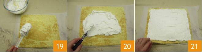 Apare a massa de biscoito cortando as bordas e despeje ¾ do creme 19 cuidando para deixar um centímetro sem cobrir das bordas 20. Comece a enrolar ajudando-se com o papel manteiga 21.