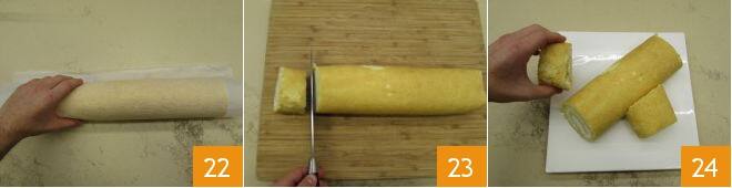 Sele bem e coloque na geladeira para firmar por pelo menos algumas horas junto com a tigela com o creme restante 22. Depois do tempo, retire o papel manteiga e corte duas partes em diagonal, uma um pouco mais longa que a outra 23. Coloque a parte central do tronco no prato de servir e as duas extremidades de forma desalinhada, para representar de maneira realista um tronco 24