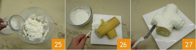 Recupere o creme, dilua com um pouco de creme de leite, apenas o suficiente para amolecê-lo 25 e glace o tronco 26, cuidando para não cobrir a parte que parece o interior do tronco 27.