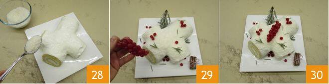 Polvilhe a superfície com o coco ralado 28 e coloque na geladeira por mais meia hora. Finalmente, decore com bagas de groselha e alguns raminhos de alecrim 29. Aqui está o seu tronco de Natal nevado: felicidades 30!