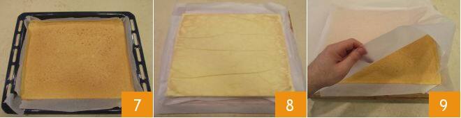 a massa de biscoito assa em forno já aquecido a 220°, por cerca de 8-9 minutos 7. Quando estiver pronta, vire-a sobre uma folha de papel manteiga e deixe esfriar 8, depois será suficiente retirar o papel com extrema delicadeza 9.