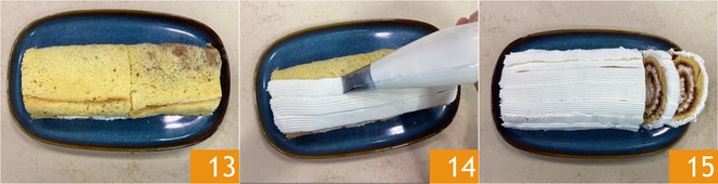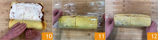 Enrole delicadamente a base de pandoro 10, embrulhe o rolo em filme plástico 11 e feche como um bombom 12. Deixe repousar no freezer por 3 horas ou na geladeira durante a noite.