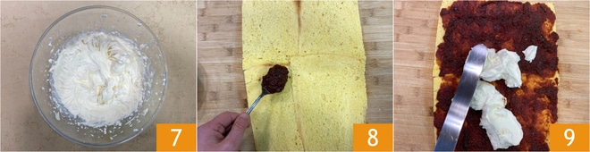 Você deve obter uma mistura batida e espumosa 7. Espalhe a base de pandoro com a geleia de cerejas silvestres 8, depois adicione cerca de dois terços do creme de ricota e mascarpone e use uma espátula para cobrir toda a superfície 9. Transfira o creme restante para um saco de confeitar com bico plano e serrilhado e reserve na geladeira até o momento do uso.