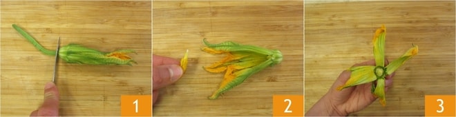 Para preparar as trouxinhas de flores de abóbora, pegue as flores, remova o talo 1, o pistilo 2 e as folhinhas pontiagudas ao redor da flor. Divida em 4 partes para obter 4 pétalas distintas 3.