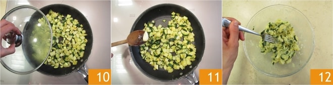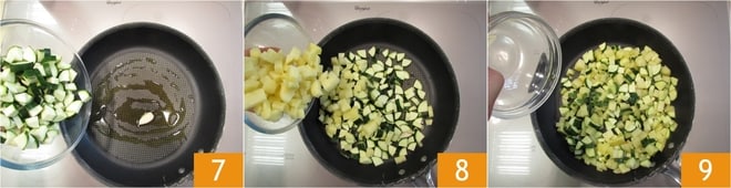 Coloque na frigideira as abobrinhas 7 e as batatas 8, salgue de modo que os vegetais liberem sua própria água e adicione o orégano fresco 9.