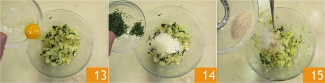 Adicione o ovo, o Parmesão, a salsinha picada 14 e a farinha de rosca 15. Ajuste o sal e misture tudo.