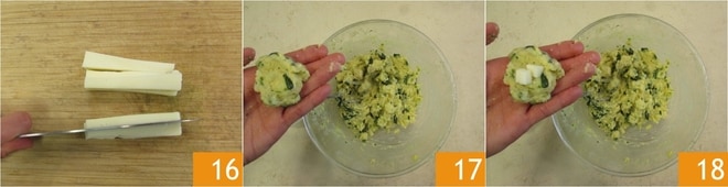 Corte o queijo em cubinhos 16. Pegue uma bolinha de massa 17, insira no centro um ou dois cubinhos de queijo 18.