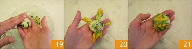 - Flores de abobrinha recheadas com presunto cru e mussarela