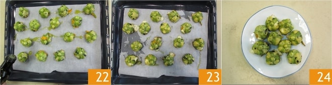 Coloque as trouxinhas em uma assadeira forrada com papel manteiga. Regue com um fio de azeite 23 e salgue. Asse em forno estático pré-aquecido a 200° por 15/20 minutos. As trouxinhas de flores de abóbora estão prontas para serem saboreadas 24.