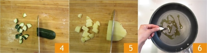 Lave e corte as abobrinhas, depois reduza-as em cubinhos 4. Descasque as batatas e corte-as em cubos 5. Amasse o alho e em uma frigideira grande, doure-o com um fio de azeite 6.