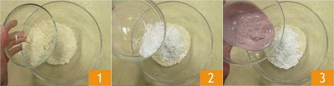 Para preparar as trufinhas de iogurte, coloque a farinha de amêndoas em uma tigela 1, depois adicione o açúcar de confeiteiro 2 e o iogurte de frutas vermelhas 3.
