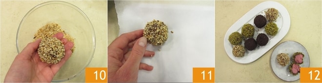 Depois de cobri-la completamente 10, coloque-a sobre uma folha de papel manteiga 11 e continue assim com todas as outras trufinhas, alternando a cobertura de avelãs com a de pistaches e com os confeitos. Suas trufinhas de iogurte estão prontas para serem servidas 12!