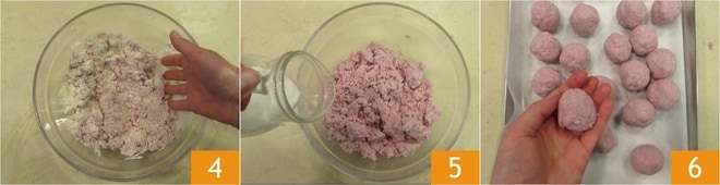 Misture os ingredientes com uma colher ou com as mãos 4, em seguida adicione o creme de leite 5 e amasse tudo até obter uma massa homogênea. Forme bolinhas com cerca de 25 g cada 6; com essas quantidades, você obterá cerca de 24 peças.