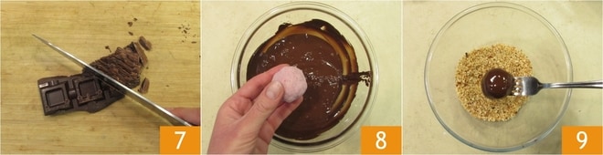 Agora pique o chocolate amargo 7 e derreta-o em banho-maria ou no micro-ondas. Coloque as frutas secas picadas e os confeitos em tigelas diferentes. Mergulhe uma bolinha de cada vez no chocolate derretido 8, depois passe-a nas frutas secas 9.
