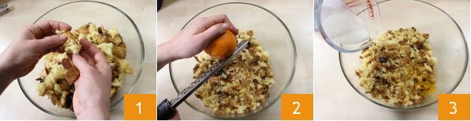 Para preparar as trufas de pandoro com chocolate, esfarele o pandoro com as mãos 1, adicione as raspas de uma laranja não tratada 2 e o creme de leite 3.