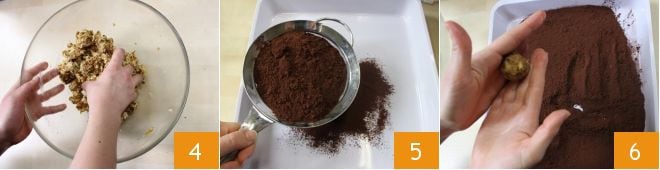 Misture com as mãos até obter uma massa modelável 4. Peneire cacau em pó em uma bandeja 5 e comece a formar bolinhas, pegando cerca de 20 g de massa para cada uma 6.