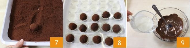 Role cada bolinha no cacau em pó 7 e coloque-as em pequenos forminhas de papel 8. Quando terminar a massa, prepare o ganache para a cobertura: derreta o chocolate amargo em banho-maria ou no micro-ondas e adicione o creme de leite que foi aquecido quase até ferver 9.