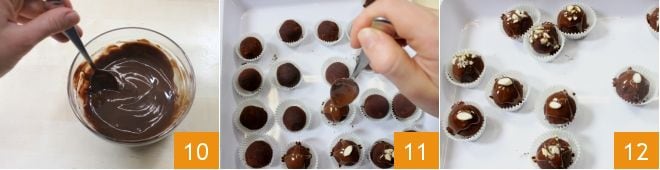 Misture bem o creme de leite e o chocolate 10, depois, usando uma colherzinha, despeje um pouco de ganache sobre as trufas de pandoro 11 e decore-as com as amêndoas ou avelãs picadas grosseiramente 12: aqui estão suas trufas de pandoro com chocolate!