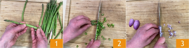 Para preparar os tubetti cremosos com ervilhas, aspargos e pecorino, comece pela Como limpar os aspargos: remova a parte final mais dura do caule 1 e corte o restante em rodelas 2, mantendo as pontas ligeiramente mais compridas. Limpe a chalota e pique-a finamente 3. Enquanto isso, aqueça água ou caldo de legumes.