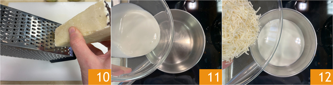 Enquanto isso, dedique-se à fonduta. Primeiro rale o pecorino 10. Em uma panelinha, coloque o creme de leite fresco 10 e adicione o pecorino ralado 12.