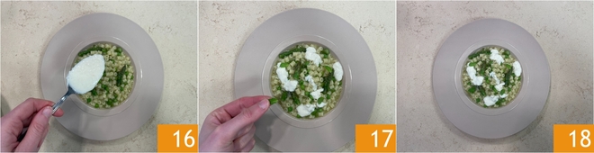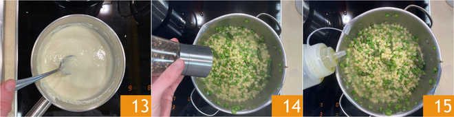 Deixe derreter em fogo bem baixo 13, mexendo de vez em quando, até obter um creme liso e homogêneo. Quando os tubetti estiverem cozidos e cremosos, desligue o fogo. Adicione uma pitada de pimenta-do-reino ralada 14 e finalize-os com um fio de azeite extravirgem 15.