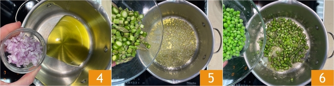 Em uma caçarola, coloque o azeite extravirgem, acrescente a chalota picada 4 e deixe-a murchar em fogo baixo por 2-3 minutos, mexendo frequentemente para evitar que escureça. Junte os aspargos cortados 5 e as ervilhas 6, então deixe pegar sabor por cerca de 5-6 minutos, mexendo de vez em quando.