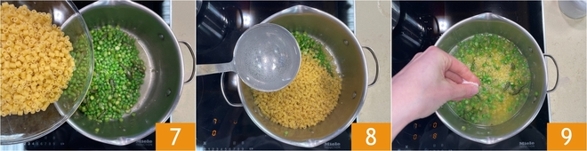 Adicione os tubetti diretamente na caçarola 7 e acrescente imediatamente uma concha de água quente 8. Prossiga o cozimento como se fosse um risoto: mexa com frequência e vá adicionando mais água quente aos poucos, à medida que for sendo absorvida, até levar a massa ao ponto. Ajuste o sal durante o cozimento 9.