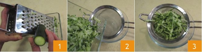 Para preparar o molho tzatziki, primeiro lave e elimine as sementes do pepino, se houver. Depois, rale o pepino com um ralador de malha larga, sem retirar a casca 1. Transfira o pepino ralado para uma peneira colocada sobre uma tigela 2 e deixe descansar por pelo menos uma hora, para que perca a água de vegetação 3.