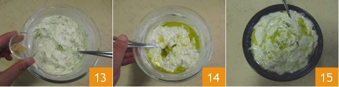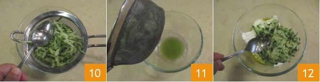 Agora esprema o pepino pressionando com as costas de uma colher 10 para eliminar toda a água de vegetação 11 e adicione ao iogurte 12.