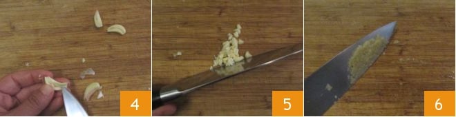 Após esse tempo, descasque os dentes de alho e elimine o miolo com uma faca 4, depois pique-os finamente 5 esmagando-os com a lâmina da faca até obter uma espécie de creme 6. Como alternativa, você pode usar um pilão com um almofariz.
