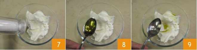 Despeje o iogurte em uma tigela, ajuste o sal 7 e adicione o óleo 8 e o vinagre 9, alternando-os entre si, depois misture bem.
