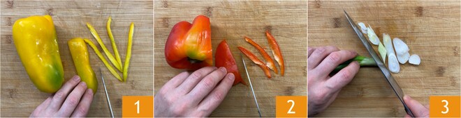 Para preparar os udon com legumes, a primeira coisa a fazer é limpar os pimentões e cortá-los primeiro em tiras e depois em fatias finas 1 2. Limpe e fatie a cebolinha 3.