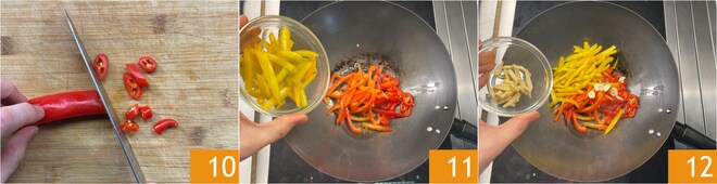 Finalmente, corte a pimenta em rodelas 10. Em um wok, aqueça uma colher de sopa de óleo de sementes, depois adicione a pimenta, o pimentão vermelho e amarelo 11, o alho e o gengibre 12.