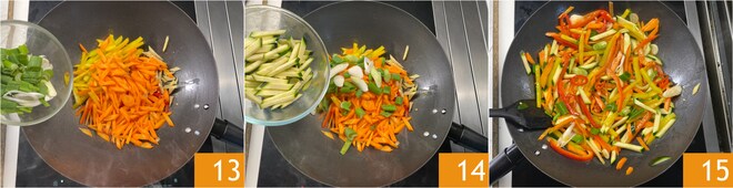 Continue com as cenouras, a cebolinha 13 e as abobrinhas 14. Cozinhe em fogo alto por cerca de 7 minutos, mexendo frequentemente 15.