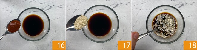 Enquanto isso, em uma tigela pequena, misture o molho de soja, o molho sriracha 16 e as sementes de gergelim 17, depois mexa 18.