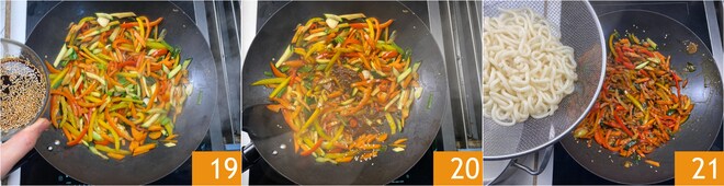 Tempere os legumes com parte do molho 19, misture bem 20 e continue cozinhando por mais 3 minutos; no total, devem cozinhar por cerca de 10 minutos. Leve uma panela de água salgada para ferver e cozinhe os udon pré-cozidos por cerca de 1 minuto. Escorra-os e transfira-os para o wok 21.