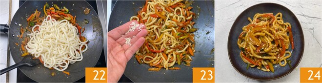 Adicione mais um pouco de molho e salteie tudo por um minuto 22, apenas o tempo necessário para misturar o tempero. Polvilhe com sementes de gergelim 23 e salteie uma última vez. Sirva e complete com sementes de gergelim a gosto. Os udon com legumes estão prontos para serem desfrutados ainda quentes 24!