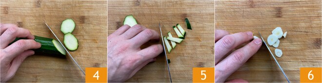 Corte as abobrinhas primeiro em rodelas 4 e depois em palitos 5, em seguida, corte o alho em fatias 6.
