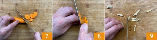 Faça o mesmo com as cenouras 7 8 e o gengibre 9.