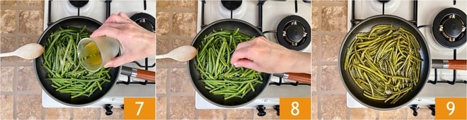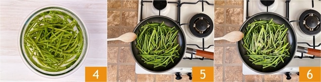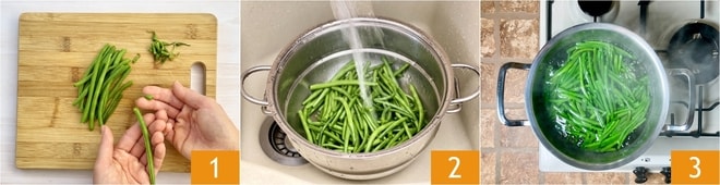 Para preparar as vagens agridoce, a primeira coisa a fazer é cuidar da limpeza. Quebre as pontas laterais 1 e lave bem sob água corrente 2. Em seguida, cozinhe em água fervente, ligeiramente salgada, por 12-15 minutos 3. O tempo de cozimento exato depende do tamanho delas.