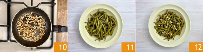 Separadamente, em uma frigideira, toste os pinhões em fogo baixo 10. Coloque as vagens em uma saladeira 11, adicione os pinhões por cima 12 e deixe esfriar um pouco antes de servir.