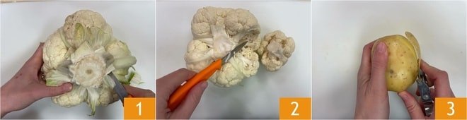 Para preparar a sopa cremosa de couve-flor e cúrcuma, a primeira coisa a fazer é limpar as couves-flores eliminando a base e as folhas 1; depois divida em floretes 2. Descasque as batatas 3.