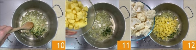 Refogue até que a cebola fique macia; depois adicione as batatas 11 e a couve-flor 12.