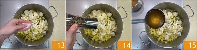 Tempere com sal 13 e pimenta 14; misture bem e cozinhe por 5 minutos. Depois adicione o caldo de legumes até cobrir 15. Leve à fervura, então abaixe o fogo e deixe ferver coberto com uma tampa por cerca de 20-25 minutos, ou até que os vegetais estejam macios.